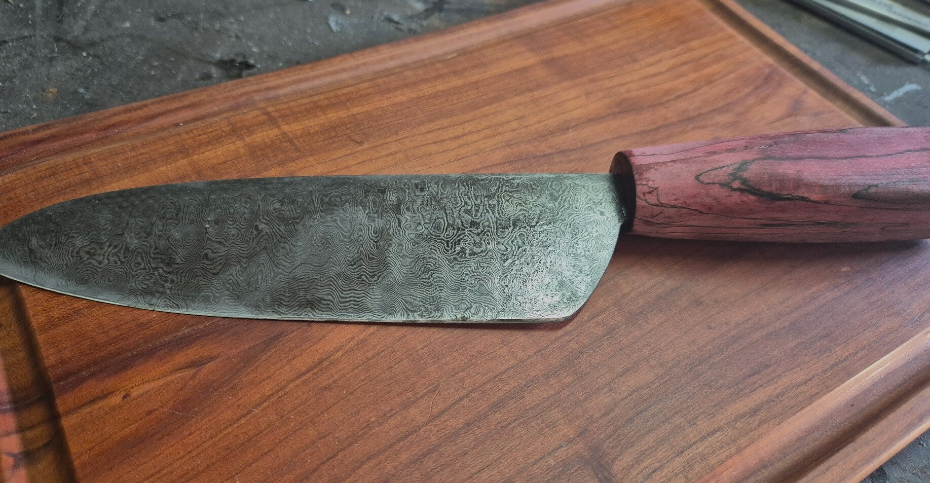 In diesem Kurs wir ein Damastkochmesser aus 1.2842 und 1.2767 hergestellt die Lagenzahl liegt bei ungefähr 115 lagen der Griff ist aus Holz und wird auf die Steckahle mit Epoxidharz verklebt .